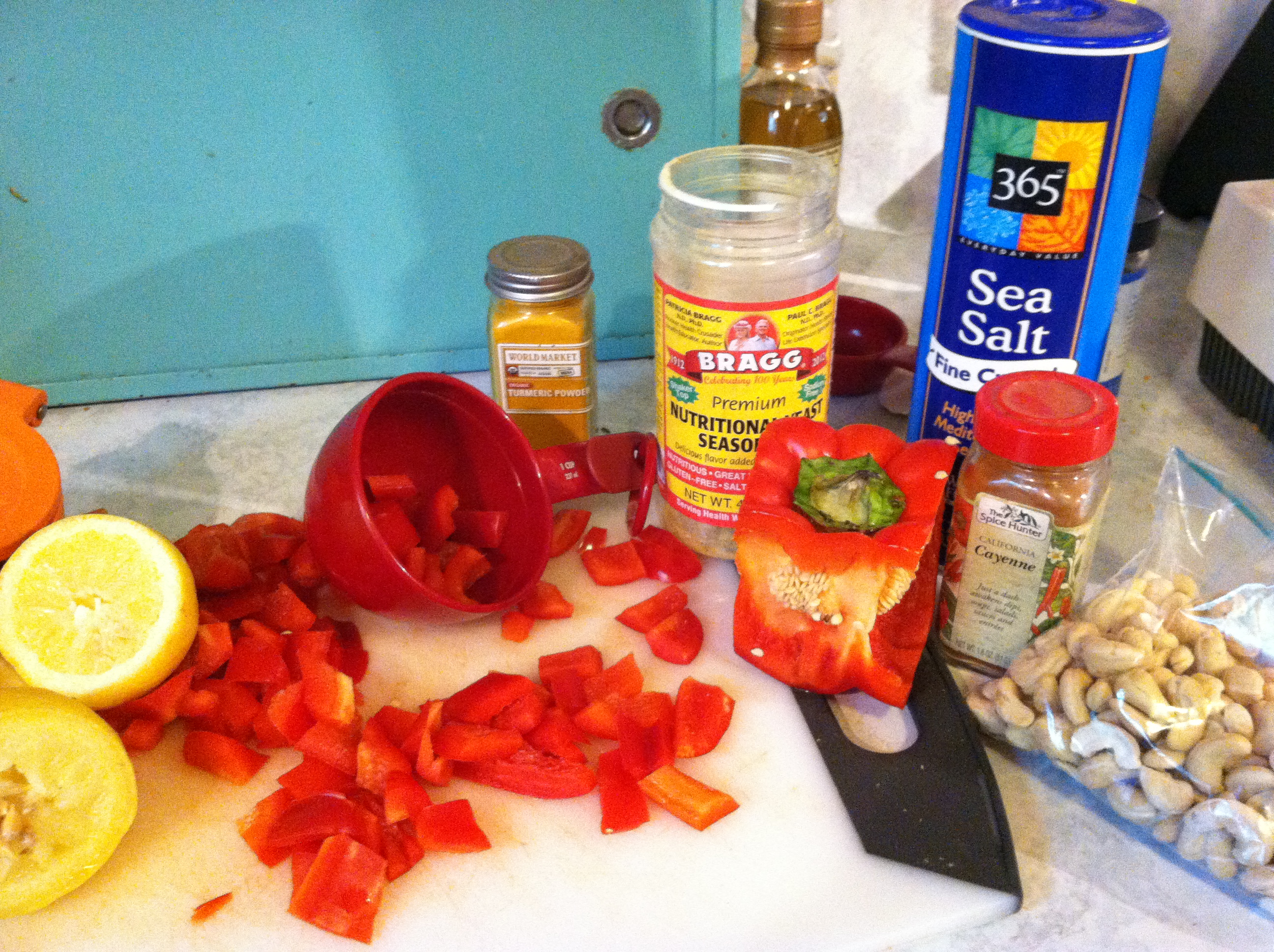 Put all of the remaining ingredients in a food processor and blend to a cheese consistency – 4 – 5 minutes. I add the water last and adjust until I think its the right consistency to schmeer on the kale. I taste as I go to determine the final amount of spices needed. If it tastes bland add more nutritional yeast, salt, pepper or cayenne. (I also add turmeric) It should be a nice nutty rich thick cheesy sauce and will fill the whole food processor!
